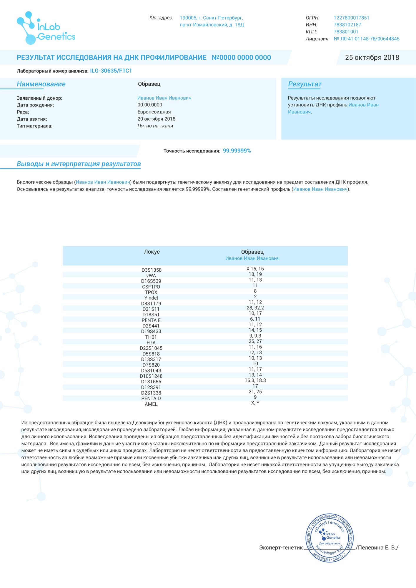 На сегодняшний день генетическая экспертиза тела или останков — это самый современный и точный метод ДНК-анализа, с точностью до 99,99999%.